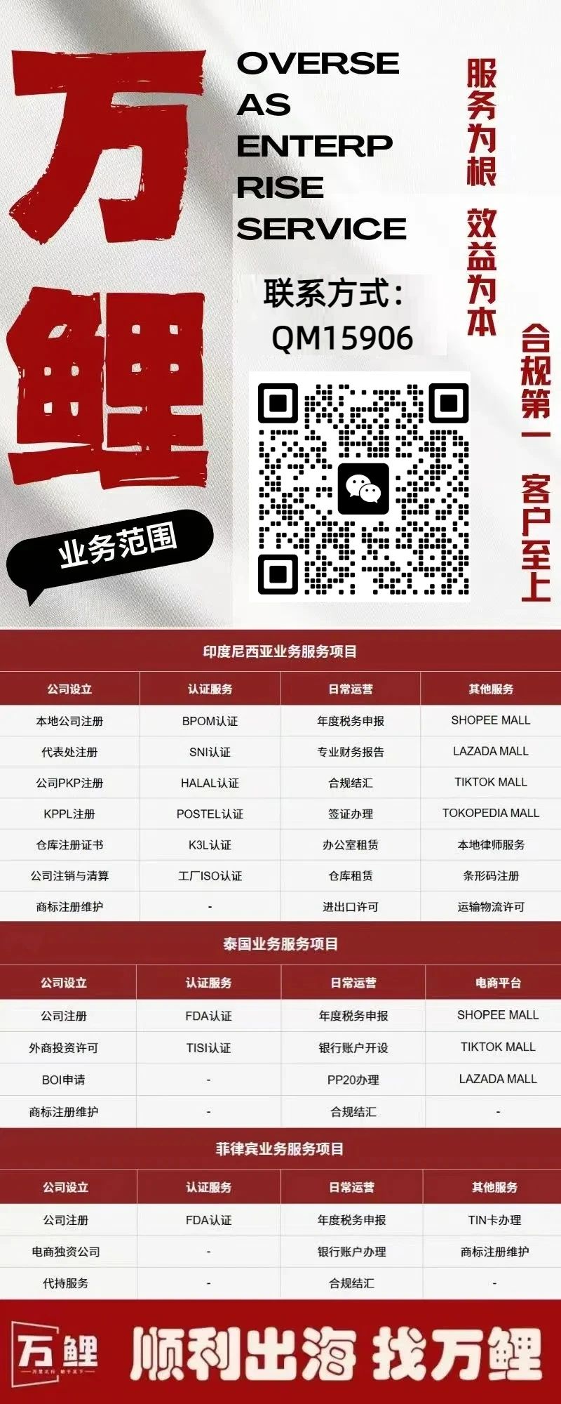万鲤出海作为企业合规出海的一站式服务平台,始终关注全球市场动态,并致力于为客户提供最专业的支持。如果您计划进入菲律宾市场,或对东南亚区域内的贸易合作感兴趣,欢迎随时联系我们。我们将以专业的服务,助力您的企业在全球贸易中抢占先机!